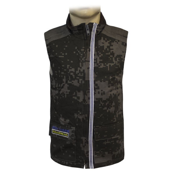 Жилет в спортивном стиле на молнии с накладными карманами. Борт изделия обработан белым кантом контрастного цвета.