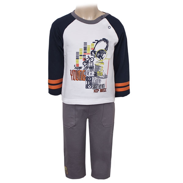 Удобный комплект для мальчика из 2х предметов: джемпер+ брюки. Джемпер в свободном крое, на груди модный принт дополненный аппликацией в виде надписи. По низу рукавов нашиты 2 яркие полоски, по плечу 2 кнопки-застежки в цвет. По талии брюк пропущена удобная широкая резинка, в передней части брюк расположены 2 глубоких накладных кармана. В нижней части изделия модная нашивка . Комплект отлично подойдет для прогулок и спортивных занятий.