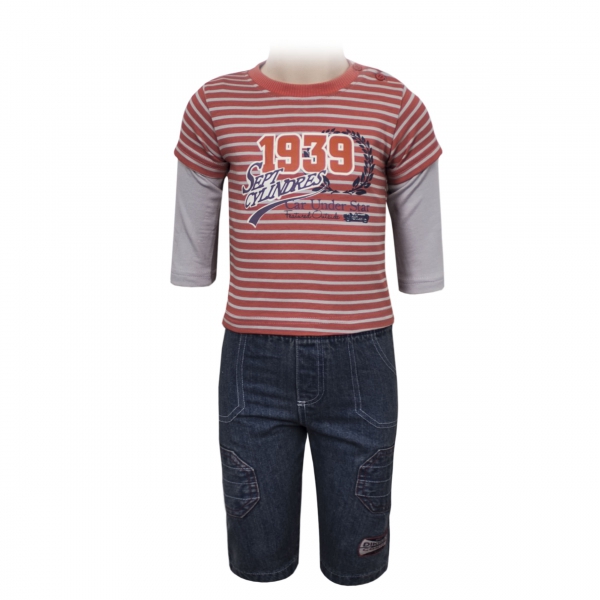 Модный комплект для мальчика из 2х предметов: джемпер + шорты. Модный джемпер в полоску с принтом на груди выполнен в спортивном стиле, на плече 2 пуговицы-застежки . Шорты выполнены из джинсовой ткани с широкой удобной резинкой на талии. Комплект отлично подойдет для игр на прогулке и в саду.