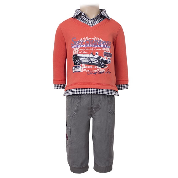 Комплект для мальчика джемпер +брюки. Джемпер выполнен в модном стиле в комбинации с воротом рубашки в клетку(обманка) также по низу изделия и рукавам проходят планки в цвет воротника. Брюки в свободном крое, по низу эластичная вязаная резинка, с боку расположен карман с аппликацией «ралли». По талии пропущена широкая удобная резинка.