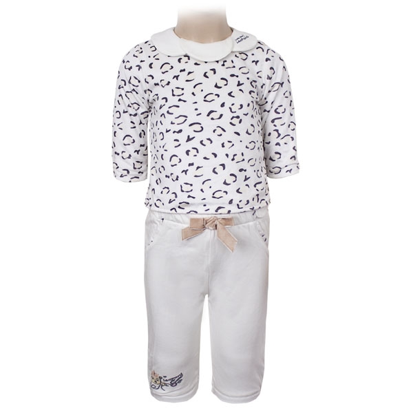 Роскошный костюм для маленькой принцессы из 2-х предметов: кофта+брюки. Кофта выполнена из очень мягкой приятной на ощупь ткани с леопардовым орнаментом. Дизайн ворота напоминает лепестки ромашки, который украшен стильной надписью и стразами. Спинка полностью растягивается с помощью кнопок в цвет ткани. Богатый дизайн брюк не оставит равнодушной ни одну маму. Бархатный бант на пояске, леопардовая окантовка по бокам, и сам леопард с короной красующийся в нижнем углу, придают изделию незабываемую красоту! По талии и по низу проходит удобная широкая резинка.