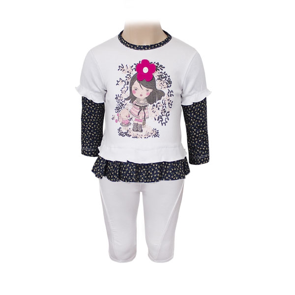 Очаровательный комплект для маленькой модницы, кофта + бриджи. На кофте веселая девочка с 3D ромашкой на волосах идет на прогулку вместе с мишкой. По низу кофты веселые рюши. Лицевая сторона капри украшена небольшой сборкой.