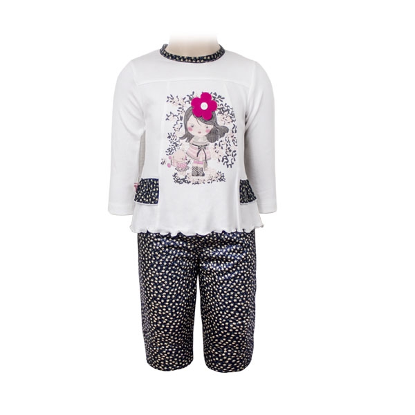 Очаровательный комплект для маленькой модницы, кофта + брюки. На кофте изображена веселая девочка с 3D ромашкой на волосах, которая очень спешит на прогулку вместе с мишкой. По бокам кофты веселые вставочки в цвет брюк. Брюки выполнены из приятной на ощупь ткани в мелкий цветочек. По талии проходит широкая резинка, изнутри подкладочная ткань.