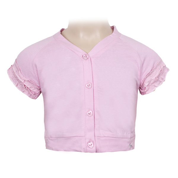 Укороченная белая хлопковая кофточка на пуговицах для девочек. Изделие с V-образным вырезом и небольшими рюшами на рукавах. В сочетании с сарафаном или высокой юбкой может послужить частью школьной формы.
