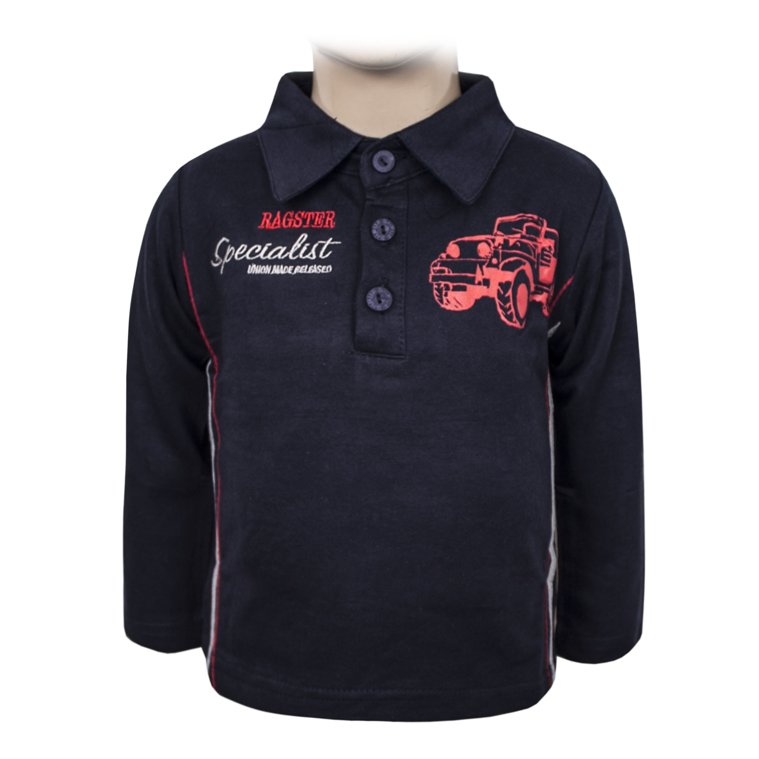 Спортивный лонгслив-поло с отложным воротничком. Горловина изделия застегивается на три пуговицы. Передняя часть кофты украшена надписями и контрастным изображением внедорожника. По бокам расположены цветные вставки в тон рисунку. Имеются два варианта расцветки.