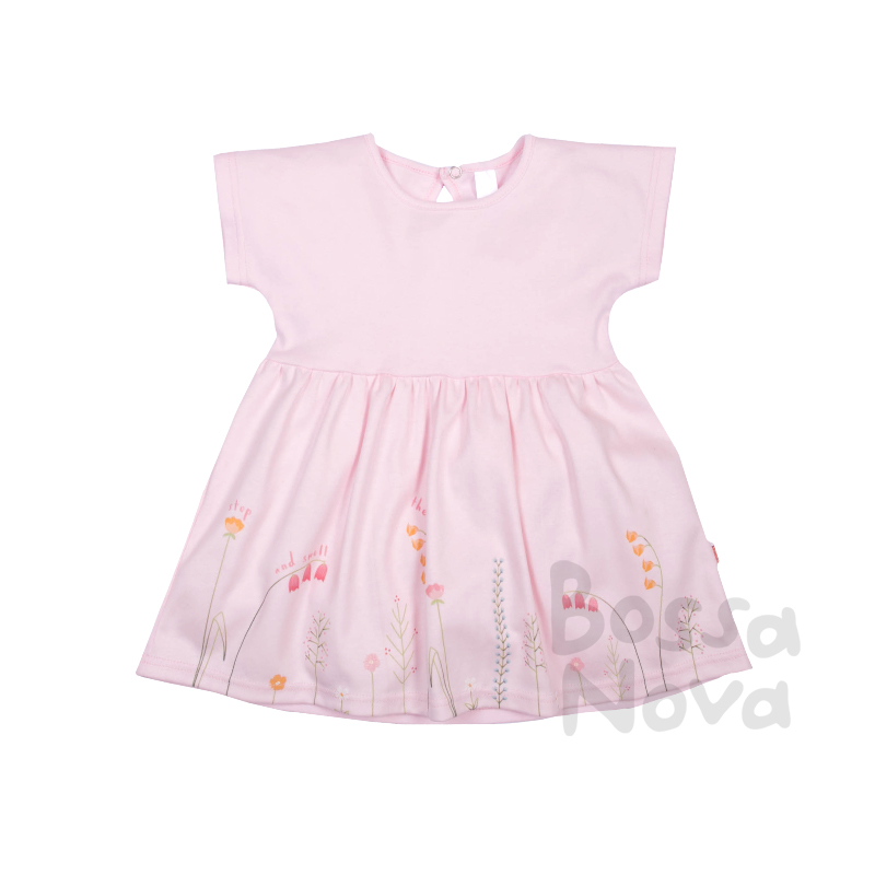 Платье для девочки из однотонного полотна. Низ платья расширенный со сборками от кокетки. Горловина обработана бейкой, рукава цельнокройные. По низу платья купонный принт.