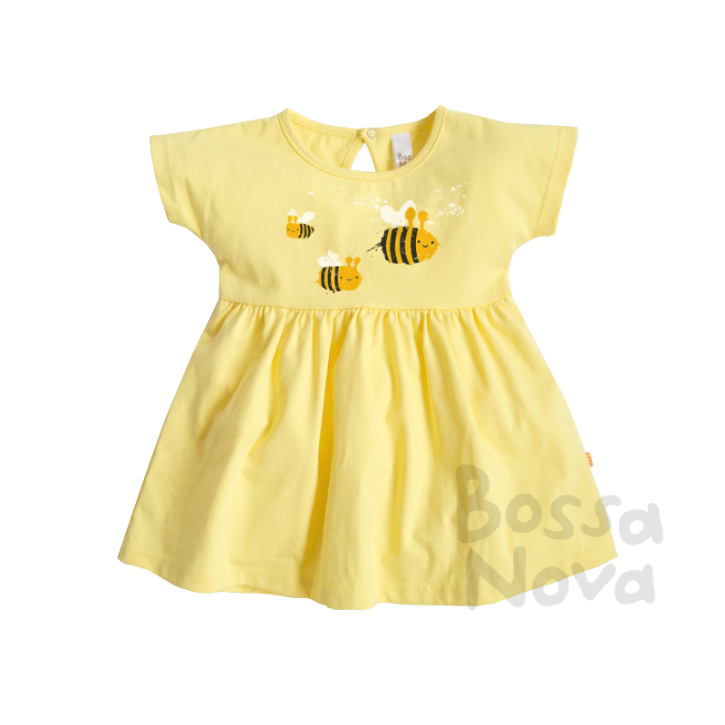 Платье для девочки из однотонного полотна. Низ платья расширенный со сборками от кокетки. Горловина обработана бейкой, рукава цельнокройные. На полочке принт.