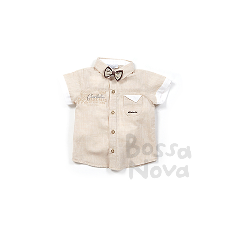 Рубашка для мальчика с коротким рукавом. Застежка центральная на петли и пуговицы. Нагрудный накладной карман. Воротник отложной со стойкой. Рукава с отворотами. На полочке вышивка. Декоративный бант на воротнике.