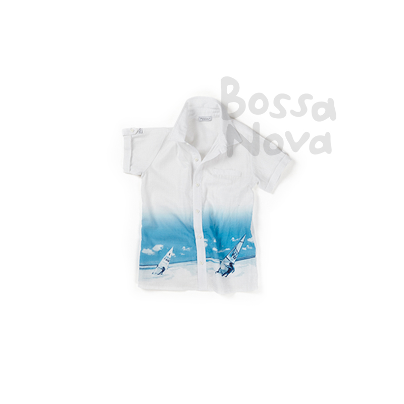 Рубашка для мальчика с коротким рукавом. Застежка центральная на петли и пуговицы. Воротник отложной со стойкой. Рукава с отворотами. По низу рубашки купонный принт.