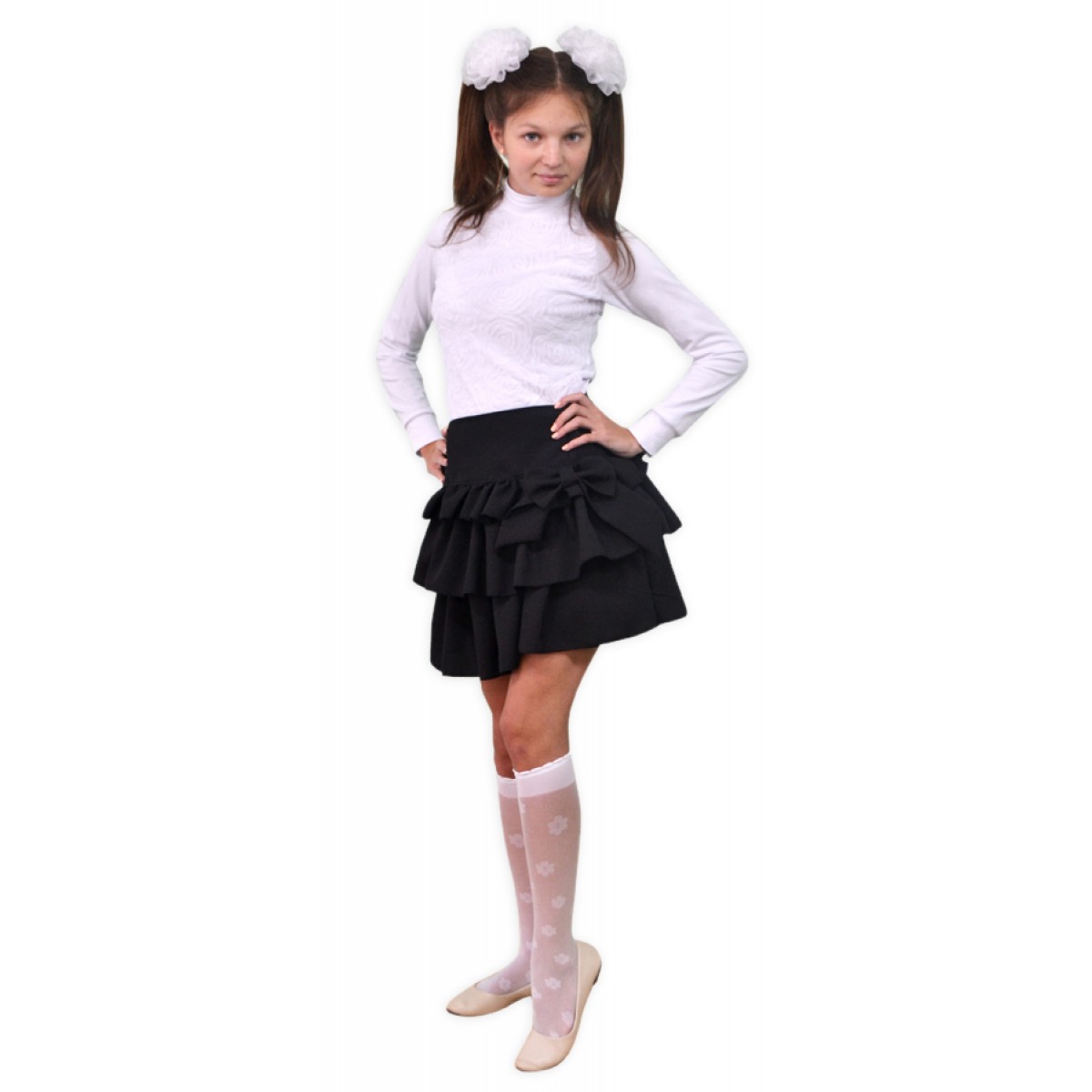 Модная, оригинальная юбка от MODESTREET с тремя оборками и кокетливым бантом с левой стороны. В наличии черного и серого цвета. Подойдет как для школы так и для праздника.