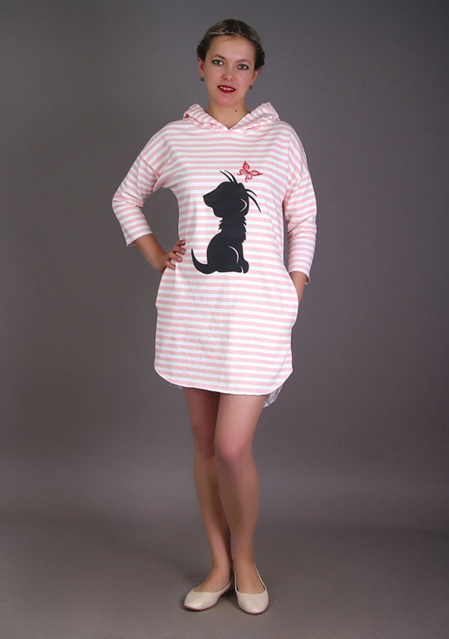 Прекрасное мягкое платье с очаровательным принтом "Киска с бабочкой" отличается удобным капюшоном и оригинальным кроем.
