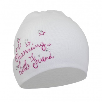 Очаровательная демисезонная шапочка для девочки. Головной убор выполнен мелкой вязкой из мягкой пряжи. Шапка не колется и удобно сидит на голове. Модель декорирована аппликациями в виде надписей, звездочек и россыпью блестящих страз. Есть разные цвета.