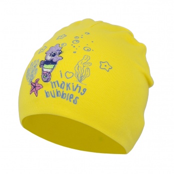 Красочная шапочка ПриКиндер с забавным принтом в виде подводного мира и надписей. Шапка мягкая и теплая, пряжа не колется и не раздражает кожу. Модель удобно облегает голову и гармонично смотрится с любой верхней одеждой ребенка. Есть разные цвета.