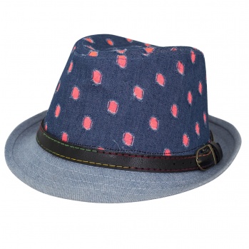 Шляпа с вмятым верхом и узкими полями – это не просто красиво, но и модно. С таким головным убором образ ребенка станет по-взрослому стильным. Шляпа выполнена из легкого хлопка, оформлена под джинсу и украшена декоративным пояском с разноцветной отстрочкой. Это отличный вариант для носки каждый день с джинсовой и спортивной одеждой.