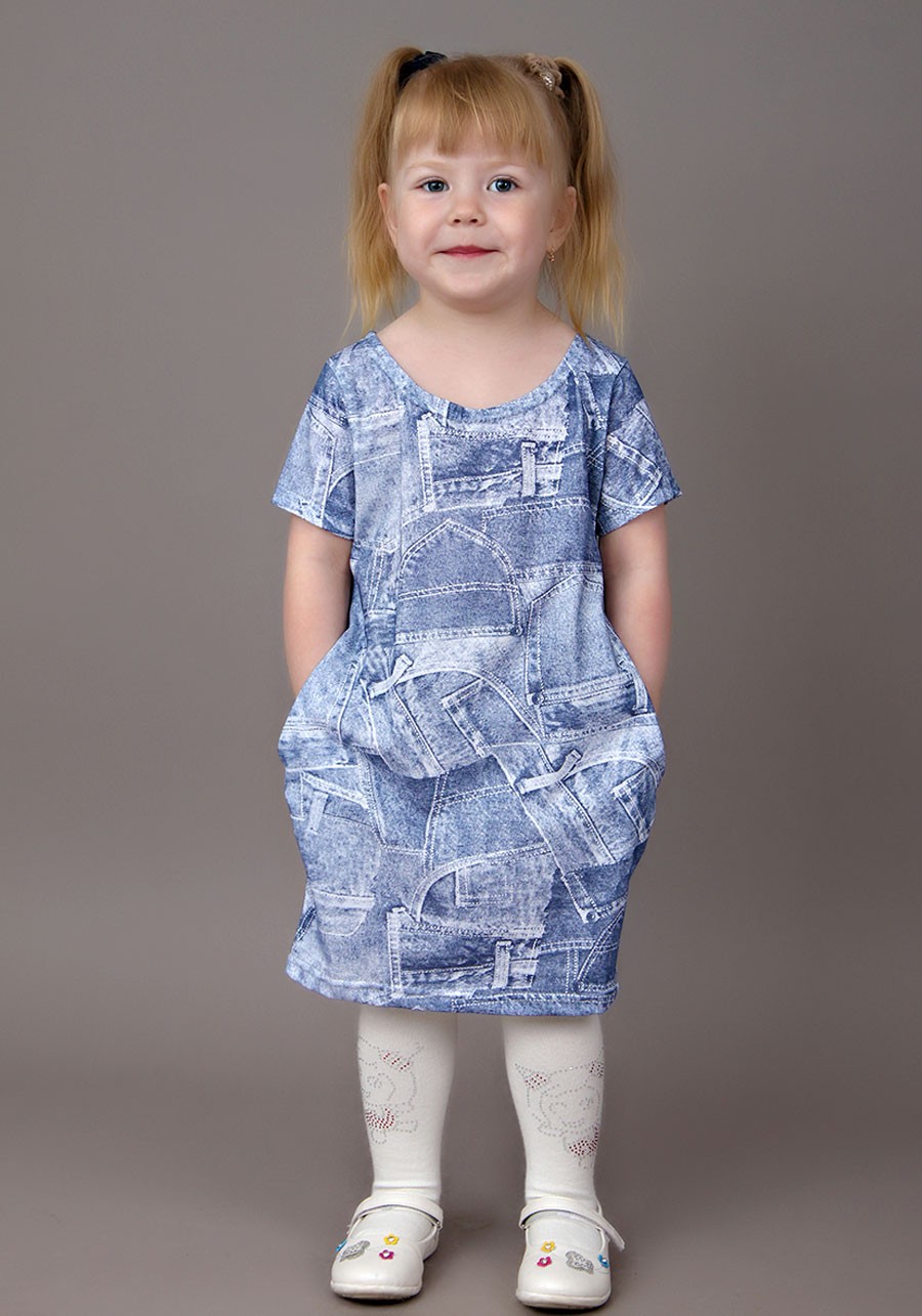 Отличное летнее платьице с подшитыми горловиной, коротким рукавом и подолом. Изделие в отличной расцветке "Джинса" дополнено двумя боковыми карманами и прекрасно сидит на любой девочке.