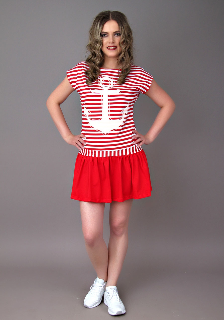 Легкое воздушное платье в морской тематике. Очарование ему придает необработанный край горловны и рукавов и пышный однотонный подол юбочки. Белый принт выполнен с использованием особой технологии вспенивания и только подчеркивает изящность платья. Изделие отлично подойдет для прогулок по берегу реки или моря, уютного домашнего отдыха, а также работы и учебы в жаркое время года.
