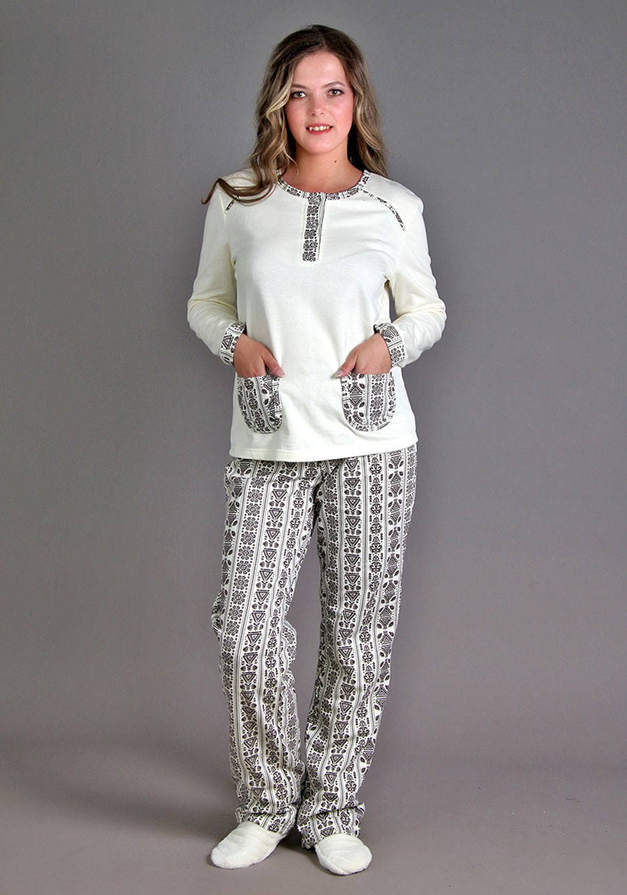 Такая милая, нежная и приятная пижама вполне может сойти за домашний костюм, ведь выглядит она очень опрятно и свежо. Основная расцветка отлично сочетается с тканью-компаньоном, контрастно оттеняя ее и визуально не перегружая образ. Горловина кофты содержит планку на трех пуговицах, рукава оформлены манжетами. Также, изделие обрадает двумя накладными передними карманами для мелочей, что безусловно является приятным дополнением. Завершает костюм прямые строгие брюки с поясом на резинке и подшитыми брючинами.