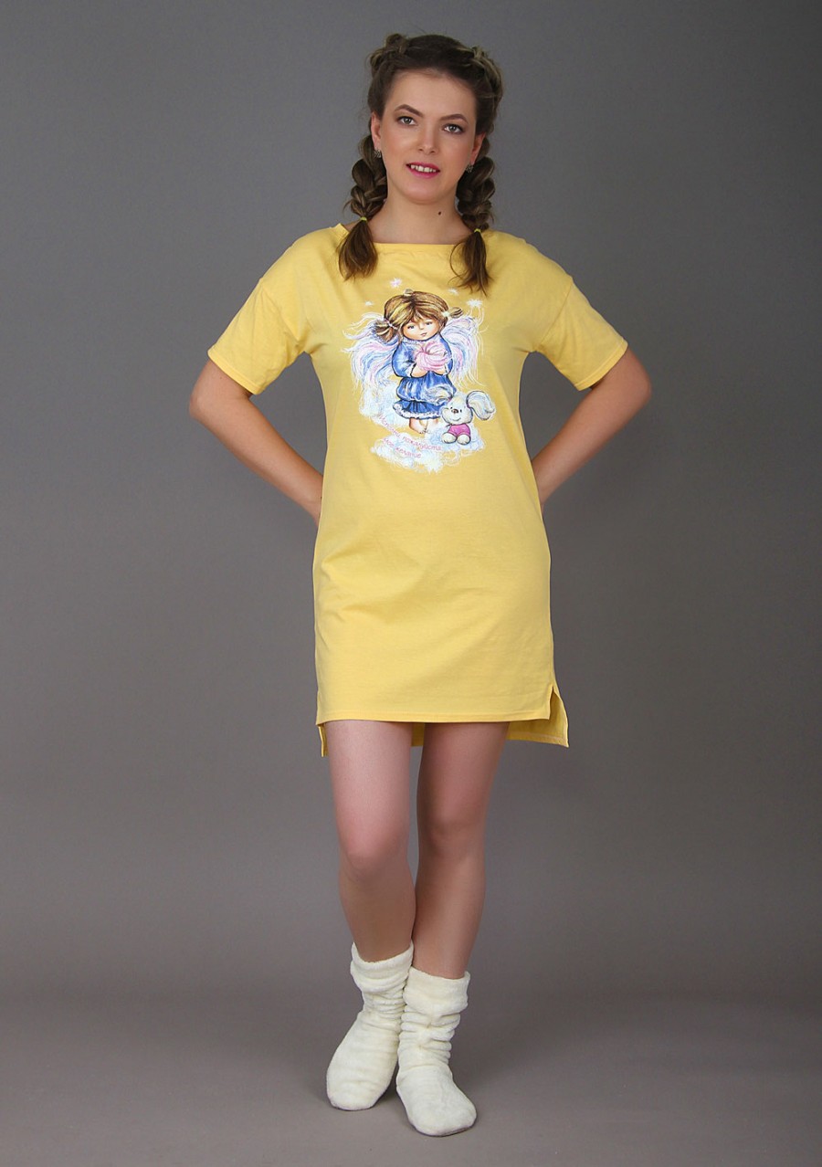 Новинка! Превосходная сорочка, которая может быть даже домашним стильным платьем! Модель "Даниэла" прямого кроя со слегка удлиненной спинкой. Смотрится просто прелестно! Окантованная широкая горловина отлично лежит на теле, подшитые рукава и подол аккуратно смотрятся. Принт "Ангел девочка" поразит Вас своей уместностью и опрятностью.