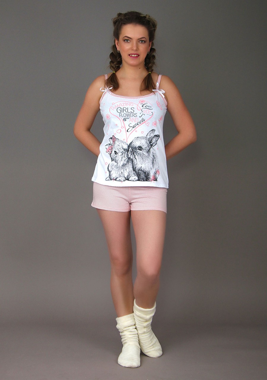 Очень миниатюрная и совершенно неощутимая на теле пижама. Маечка на лямочках с оформлением бантиков и гладким буквально прозрачным принтом отлично сидит. Шортики коротенькие и максимально комфортные.