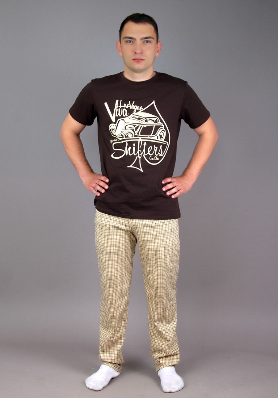 Прекрасный брючный домашний костюм для мужчин. Верх костюма - удобная футболка с большим "недетским" принтом "Las Vegas". Горловина обработана бейкой, рукава и подол подшиты. Футболка максимально комфортная, отлично сидит и не стесняет движений. Брюки без карманов, на широкой резинке, прямые. Штанинины подшиты. Брюки разработаны на средний рост - 165-175 см.