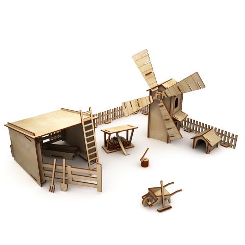 мельница - 304х112х318 ммконюшня - 207х194х156 ммконура - 70х77х58 ммзабор (4 секции) - 25х220х50 ммкормушка - 40х118х26 ммтачка - 37х99х36 ммполенница - 71х100х81 мм