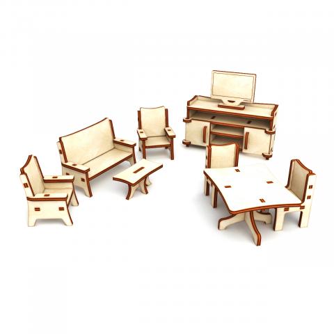 Размеры:Диван - 80*37*53ммЖурнальный столик - 50*25*23ммКресло - 40*40*53ммСтол - 70*55*40ммСтул - 30*30*50ммТелевизор - 50*10*40ммТумба - 105*40*55мм
