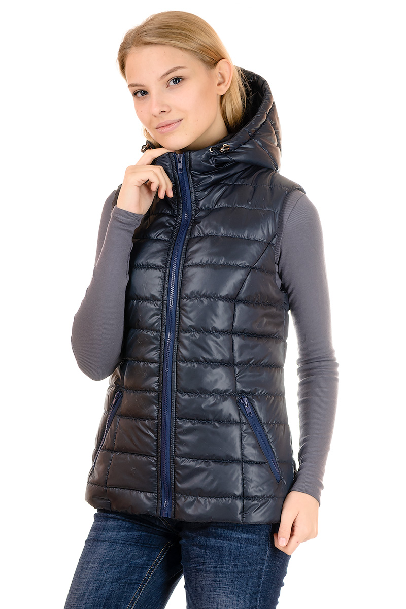 Жилет 802КА Удобный и модный предмет гардероба-Жилет,с капюшоном(не отстегивается). ткань:плащевка "ЛАКЕ", утеплитель силикон, подкладка принт нейлон р.44.46.48.50. Длина жилета: , 44р-62см, 46р-63см, 48р-65см, 50р-66см цвет:синий