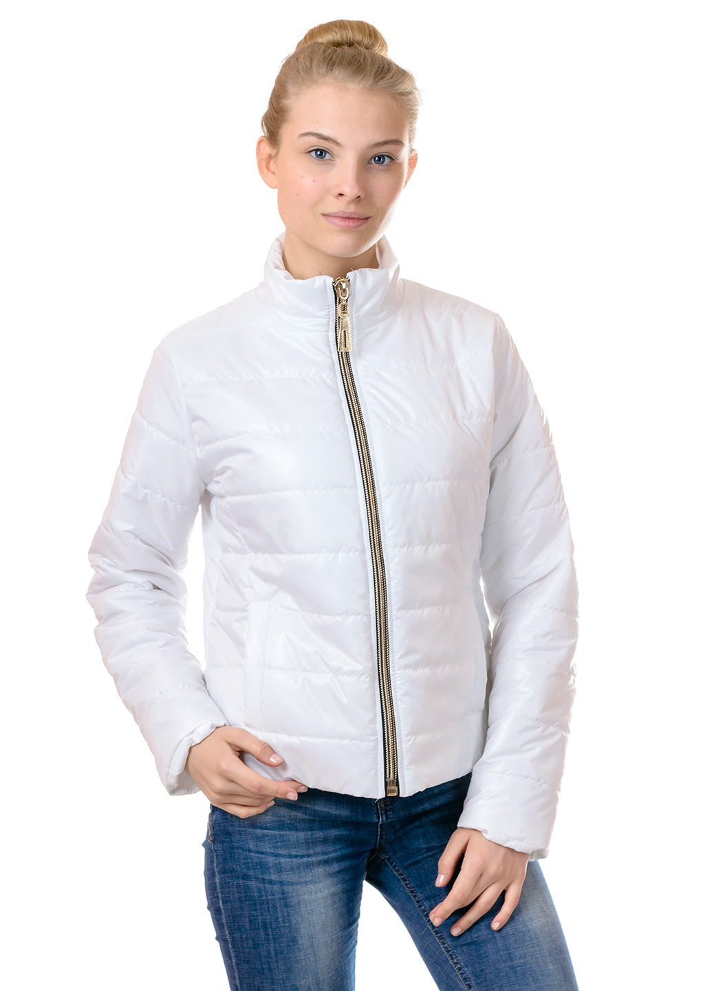 Стильная женская демисезонная куртка, утепленная на синтепоне на сезон осень-весна. Модель приталенного силуэта, красиво "садится" по фигуре. Застежка изделия - молния.ткань:плащевка р.42.44.46.48 цвет:белый