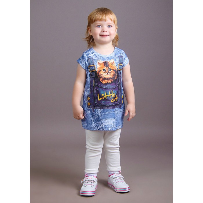 Бесконечно милый костюм, состоящий из кофточки с коротким рукавом и бриджиков. Сочетание цветов изумительное - светлый нежный низ изумительно смотрится с дерзким джинсовым верхом. Бриджики на резинке абсолютно удобны благодаря плотному, но мягкому прилеганию к телу, а кофта с коротким рукавом не дает ребенку почувствовать чрезмерное тепло и вспотеть, ведь костюм полностью выполнен из материала интерлок-пенье – самой лучшей ткани для детской одежды. Принт не требует особого описания – милый котёнок выглядывает из нагрудного кармашка, изящно сложив лапки.