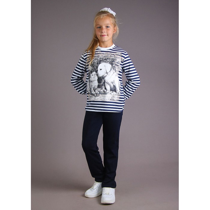 Отправляете ребенка в лагерь, на тренировку или на прогулку и не знаете, какой костюм выбрать? С костюмом «Парочка» Вы точно не прогадаете, ведь он состоит из однотонных брючек на манжетах с резинкой на поясе и полосатой кофточки со светлыми манжетиками на рукавах и большим красивым принтом. Горловина изделия обработана бейкой, подол подшит. Идеальный выбор для всех времен года.