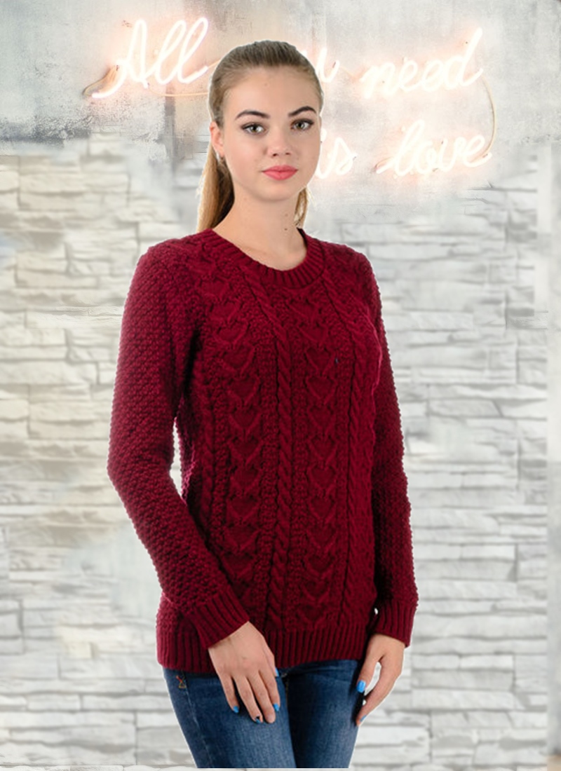 Свитер женский J527B .Удобный вязаный свитер с длинным рукавом. Цвет: бордовый. Состав: 65%-акрил,20%-полиэстр,15%-эластан. Вырез овальный. Размер: 42, 44, 46