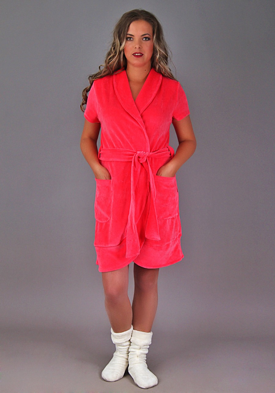 Безупречный очаровательный халат с коротким рукавом и воротником-шалью, переходящим в подборт. Модель на запах на поясе – теперь можно не мучаться с пуговицами и молнией. Изделие мега-удобное, ведь оно обладает двумя нашивными карманами для мелочей. Изделие отлично сочетается с сапожками. Подол оформлен оборкой для большей изящности халата.
