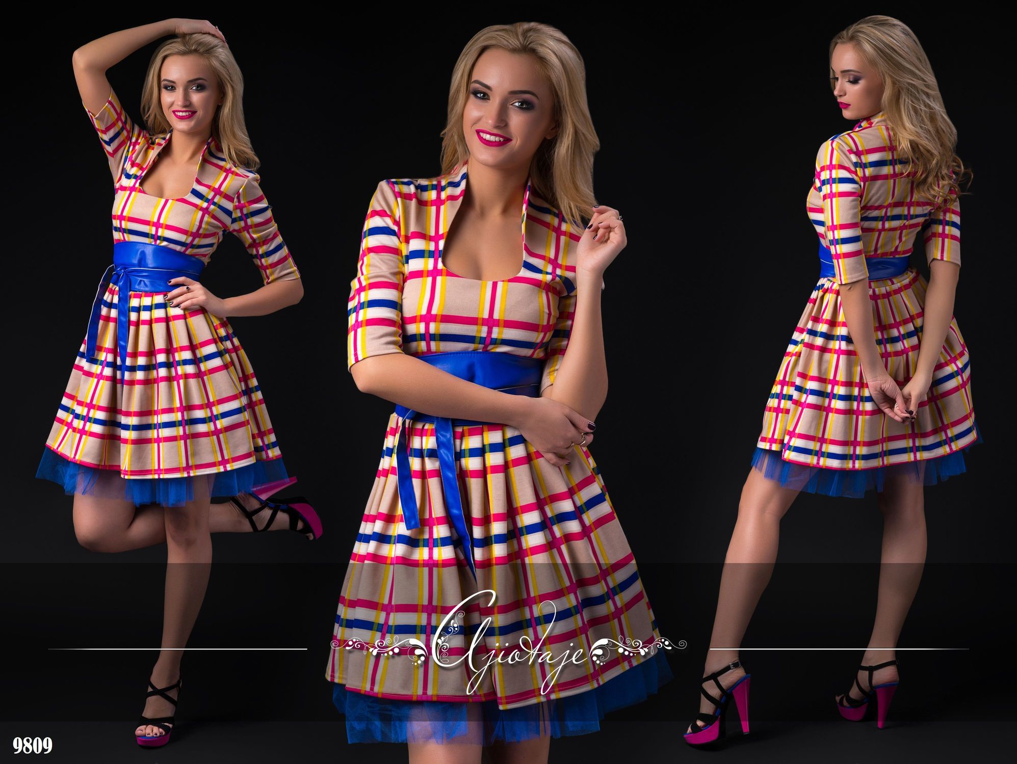 Платье в клетку с поясом из экокожи.