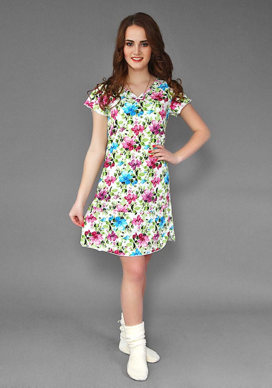 Славная, нежная и очаровательная сорочка Марфа в цветастой расцветке. Удобный расширенный к низу силуэт, короткий рукав, окантованная горловина, легкий волан по подолу изделия.