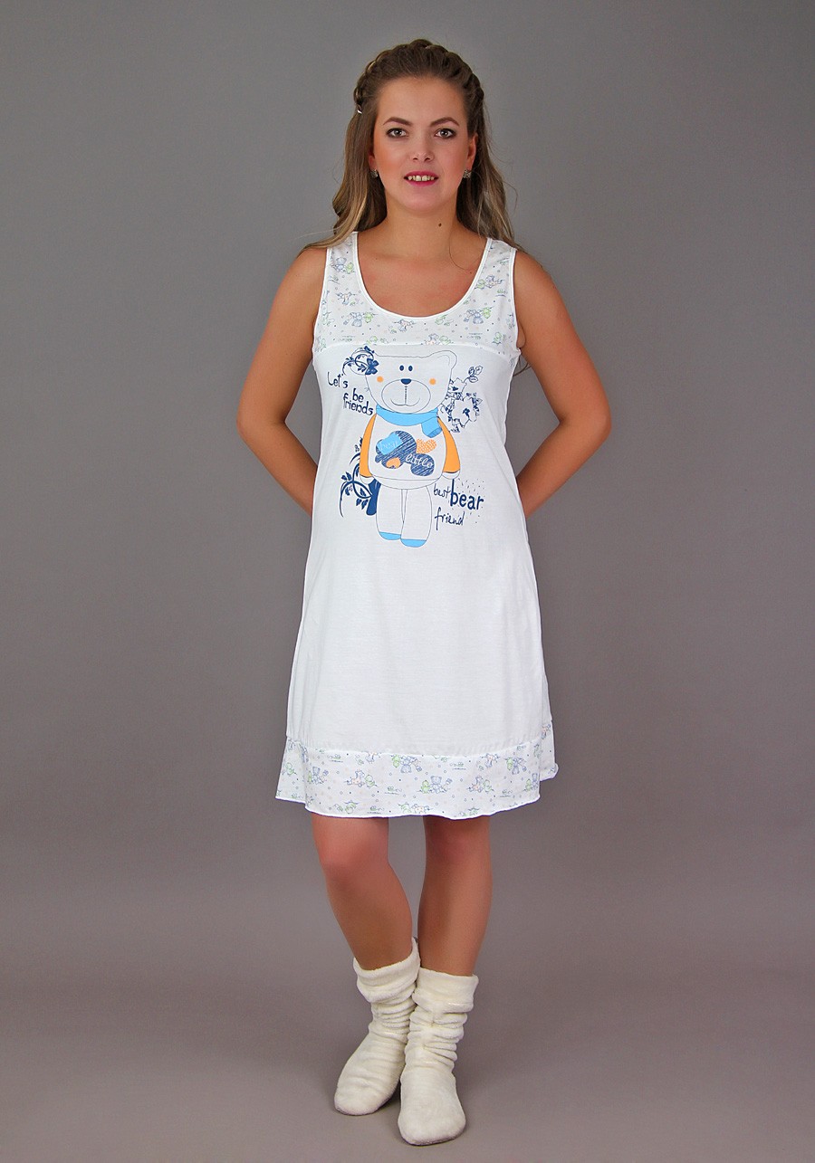 Ткань: кулирка. Состав: 100% хлопок.Универсальная красивая сорочка с милым принтом "Мишка" прекрасно подойдет для сна, благодаря отсутствию рукавов, натуральности используемого материала и спокойным расцветкам. Легкая и воздушная - модель точно понравится любителям простора и свободы во сне.