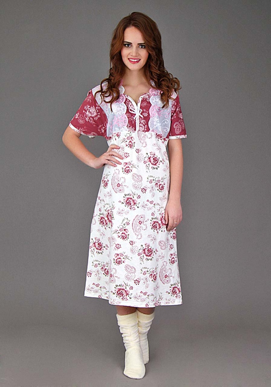 Ткань: кулирка. Состав: 100% хлопок.Длинная красивая сорочка поразит любую своим изяществом! Цельнокроенные короткие рукава, прямой крой, декоративная кокетка, оформленная шитьём и бантиком изумительно сочетаются с цветовой гаммой изделия. Молочный цвет контрастно смотрится с богатым бордо.