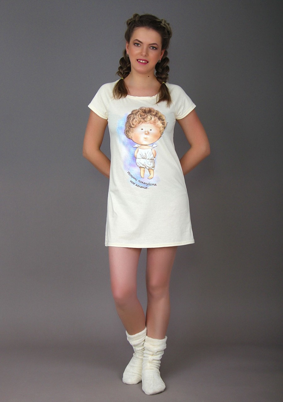 Ткань: кулирка. Состав: 100% хлопок.Преимущества модели "Дана" можно перечислять до бесконечности. Коротенький рукав, оптимальная длина, до восхищения милый принт "Ангел мальчик". Говорят, если верить в мечту, то она обязательно исполнится, а ангелок обязательно в этом поможет;)