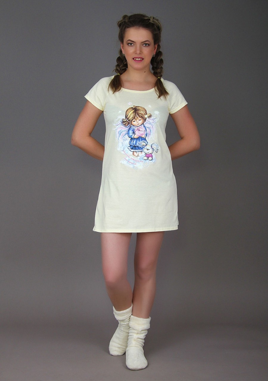 Ткань: кулирка. Состав: 100% хлопок.Часто случается, что по весне кружит голову романтичное настроение. Хочется чего-то нежного, милого и невинного... Сорочка "Дана" в спокойных расцветках и с очаровательным принтом "Ангел девочка" прекрасно удовлетворит Ваше желание. Коротенький рукавок, удобная длина и слегка расклешенный крой позволит чувствовать себя в изделии максимально комфортно.