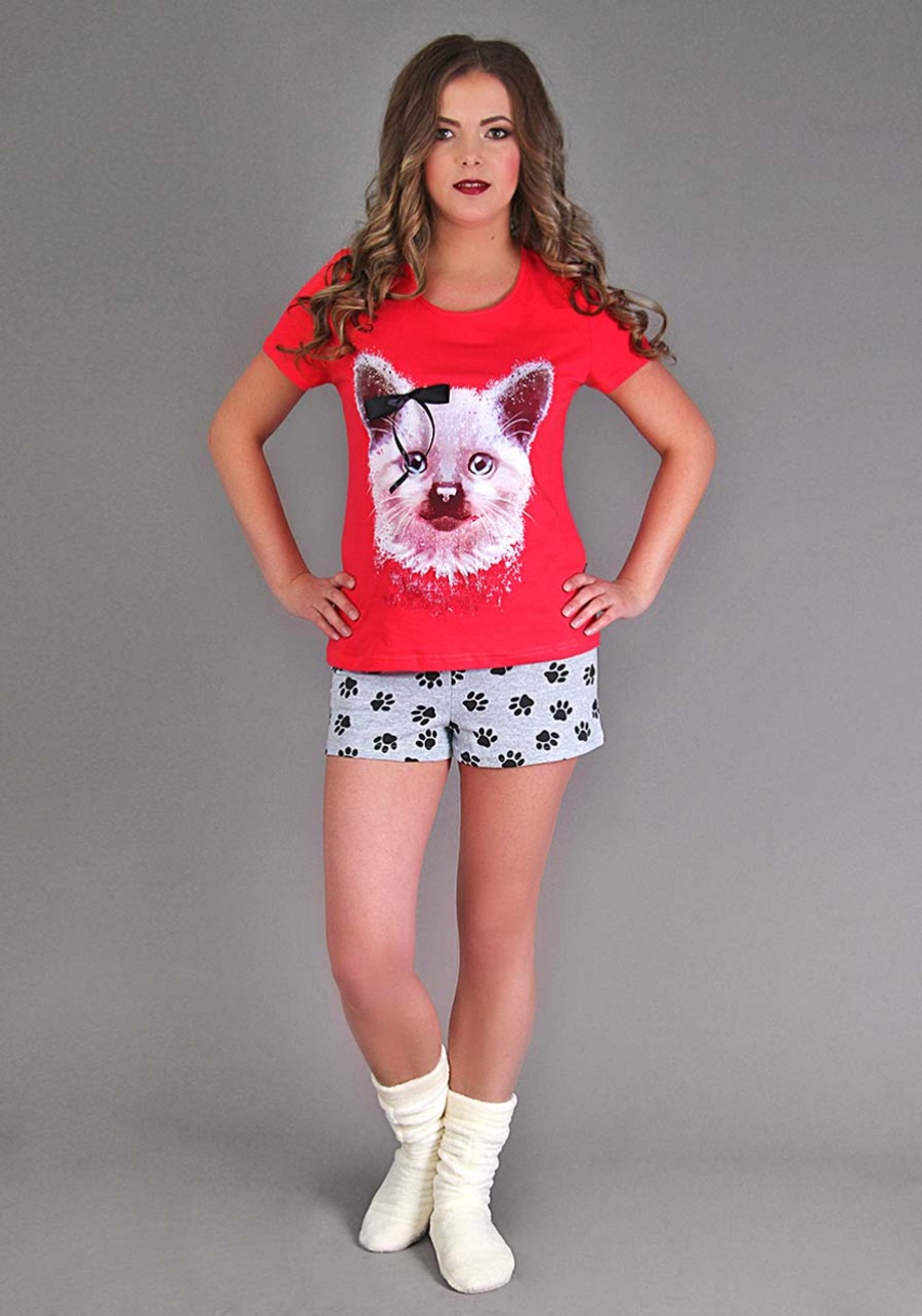 Яркая расцветка и милый принт "Кошечка" новой пижамы Люся не оставят равнодушными никого. Горловина футболки обработана бейкой, рукава и низ её подшиты также, как и низ шорт с поясом на резинке.