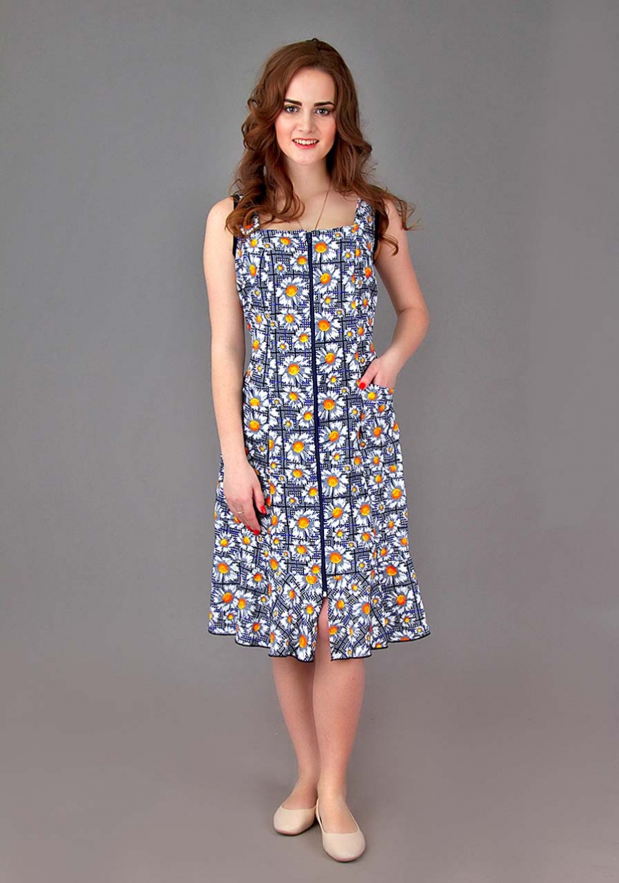 Прекрасный летний сарафан на молнии с широкими лямками, на поясе и с двумя карманами. Проймы окантованы, подол обработан краевым швом.