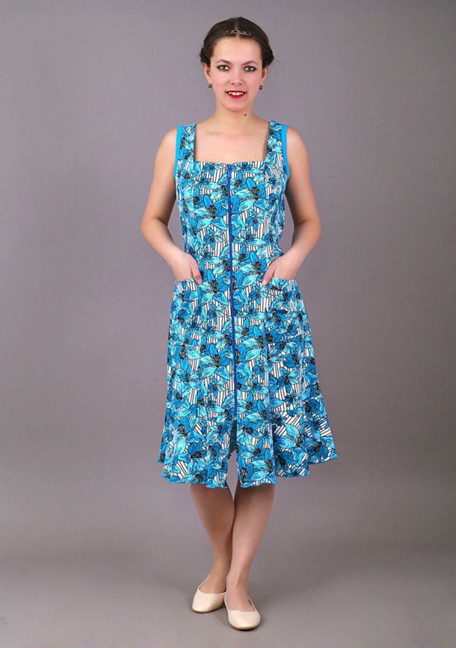 Прекрасный летний сарафан на молнии с широкими лямками, на поясе и с двумя карманами. Проймы окантованы, подол обработан краевым швом.