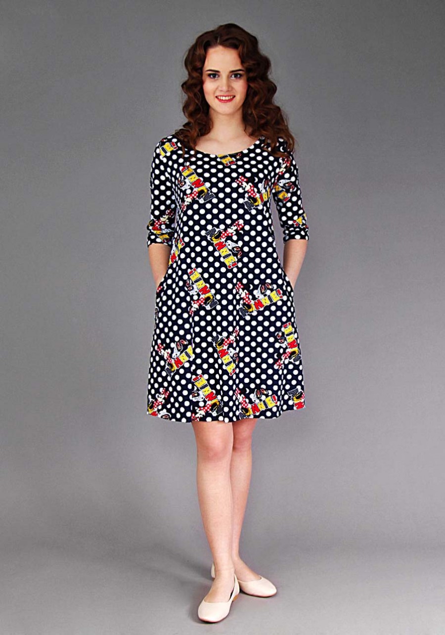 Удобное платье как для дома, так и для прогулок. Горловина и рукава подшиты, свободный крой не будет стеснять движений, подол не обработан для придания оригинальности образу. Изделие обладает двумя боковыми карманами для мелочей. А расцветка с Мики Маусами придаст игривости Вашему образу.