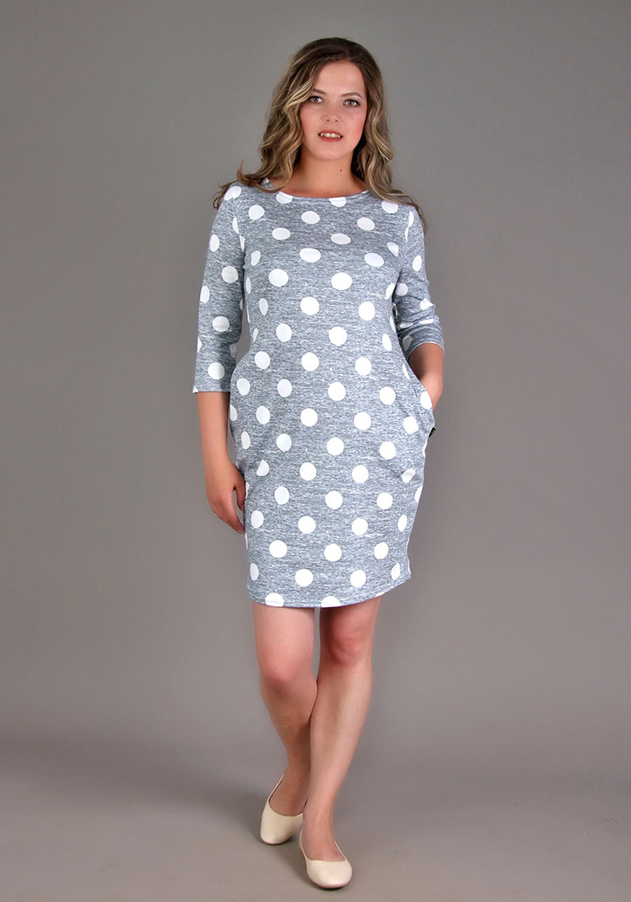 Ткань: пенье. Состав: 100% хлопок.Восхитительное платье для дома и отдыха! Высококачественный интерлок-пенье в расцветке "Серый" прекрасно сочетается с белым горохом и звездами. Боковые карманы визуально улучшают фигуру, а умеренная длина не мешает движению.