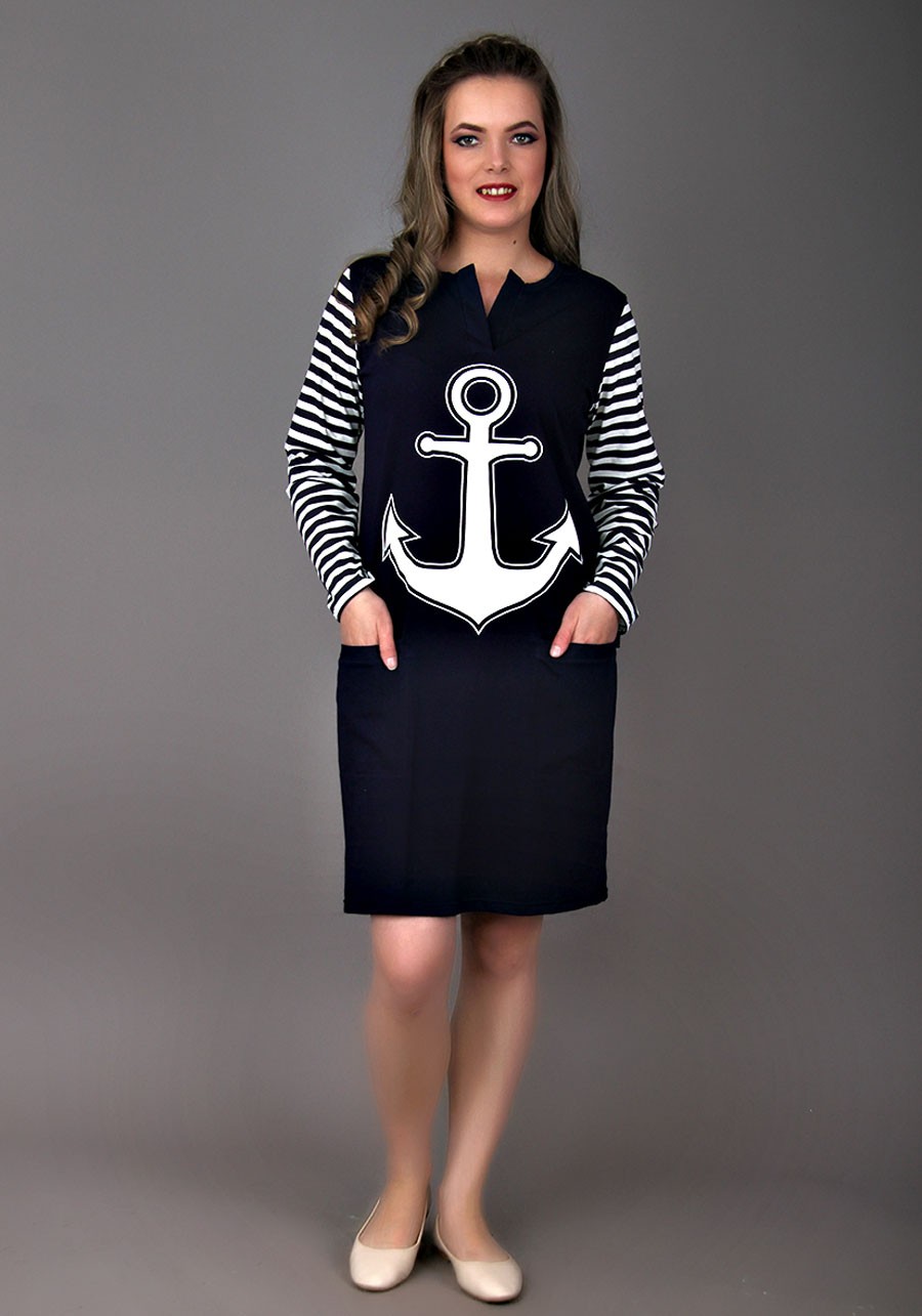 Ткань: кулирка. Состав: 100% хлопок.Морской стиль в одежде, безусловно, вне времени! Цветовое сочетание темно-синего и молочного подходит без исключения всем женщинам. Платье "Оксана" - новая модель, завоевавшая свою популярность с самого момента создания. Длинный подшитый полосатый рукав прекрасно сочетается с однотонной основной частью изделия, которое обладает планкой на груди. Горловина окантована, подол подшит. Украшают платье большие карманы спереди и выделяюшийся объемный белый принт "Якорь".