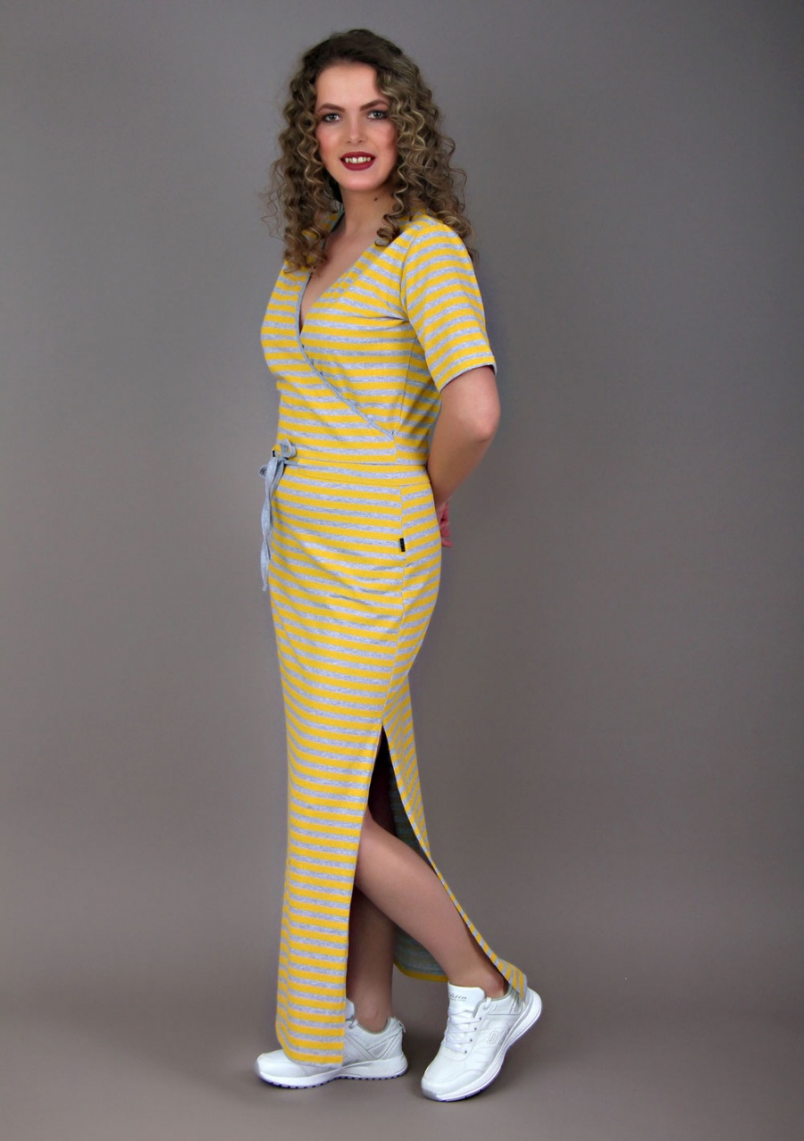Ткань: кулирка. Состав: 100% хлопок.Платье прекрасно подходит для дома и отдыха. Обладает окантованной горловиной, подшитыми рукавами и подолом. Отличительной чертой модели является небольшой разрез нижней части изделия. Яркие цвета полосы гармонируют со спокойным серым цветом-основой.