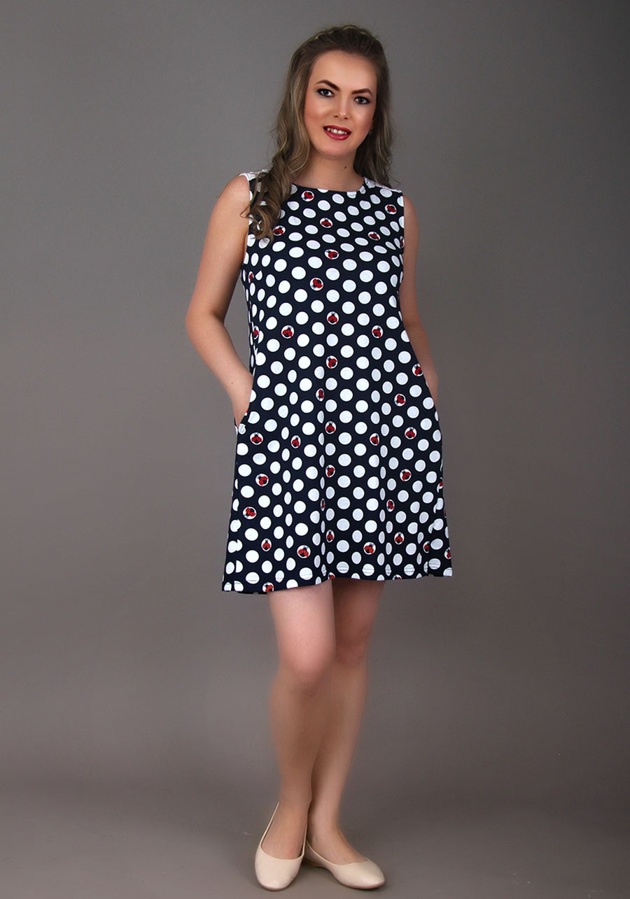 Ткань: кулирка. Состав: 100% хлопок.Что может быть лучше на лето, чем опрятное платье без рукавов? А если оно еще и в модную расцветку "Белый горох"? Спешим порадовать Вас новой моделью "Сандра"! Платье обладает боковыми карманами и подшитым подолом. Спинка оформлена нежным шитьём в цвет горошка и большим бантом. Любая модница будет в восторге от этого платья!