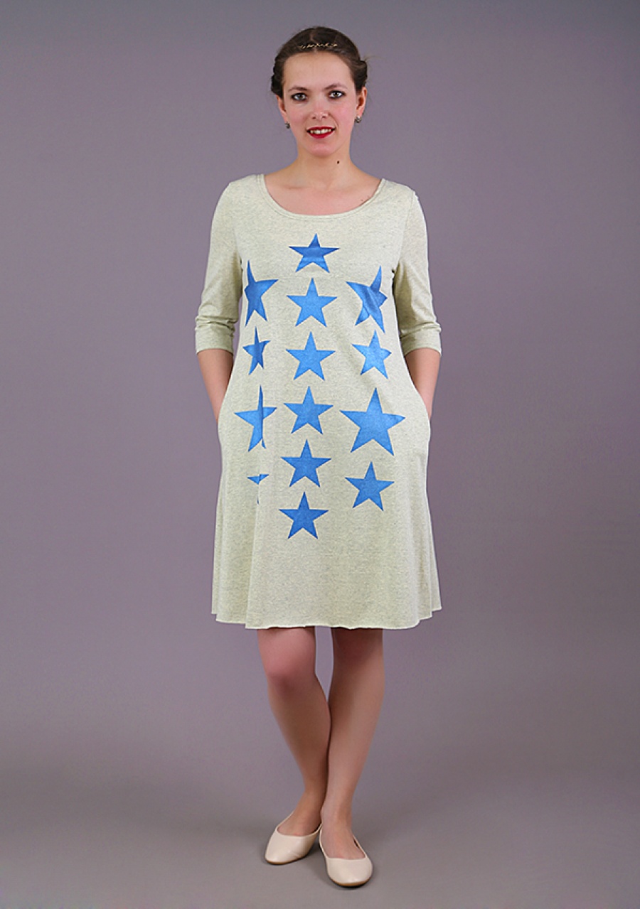 Ткань - кулирка. Состав: 100% хлопок.Легкое и воздушное платье придаст Вашему образу гармоничность, а необработанный край добавит креативности и индивидуальности. Яркие звезды привлекут внимание окружающих, качество ткани порадует самую искушенную модницу, а удобство носки и привлекательная практичность не оставит равнодушным людей, ставящих на передний план широту использования и комфорт.