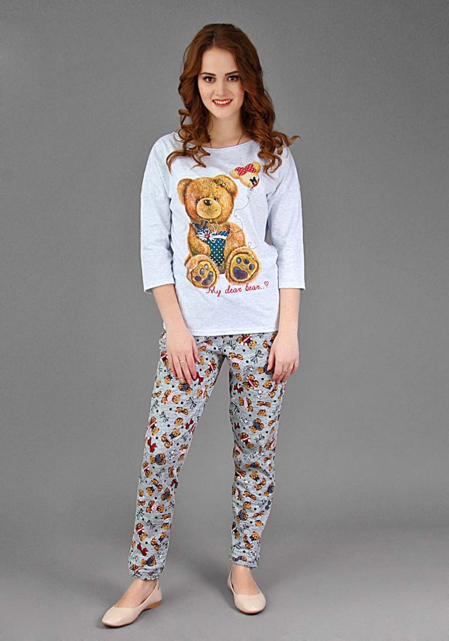 Очаровательный костюм для дома и отдыха с милым принтом "Мишка с шаром". Кофта подшита со всех сторон, брюки обладают поясом на резинке и шнурком, двумя карманами и манжетами. Ткань очень легкая и приятная в носке.