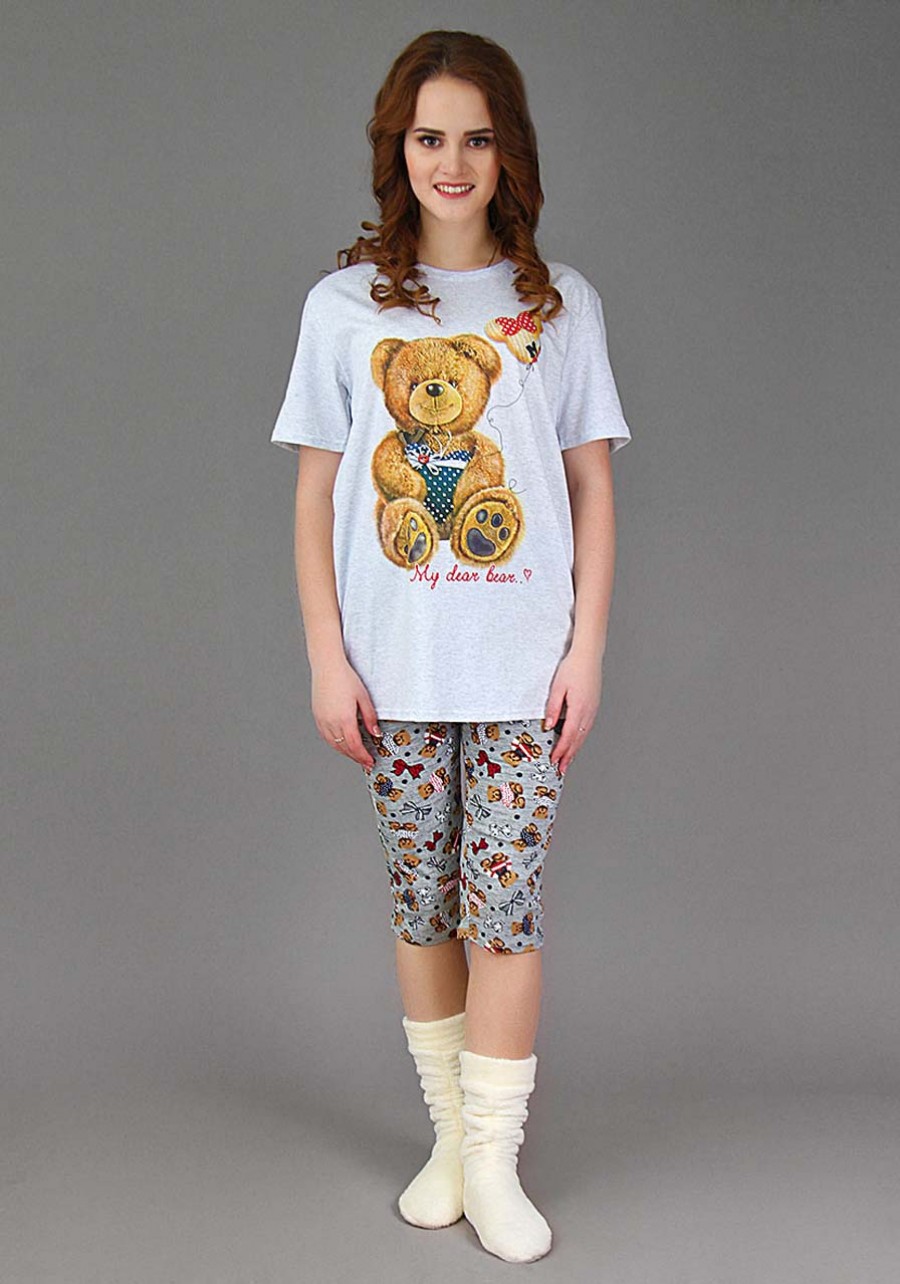 Костюм <<Жанна>> состоит из прекрасной футболки с горловиной, обработанной бейкой и подшитыми рукавами и подолом, а также из бриджей с поясом на тонкой резинке. Очарование изделию придает принт "Мишка с шаром". Костюм великолепно подойдет не только для бытовых дел и отдыха, но и для лёгких домашних тренировок.