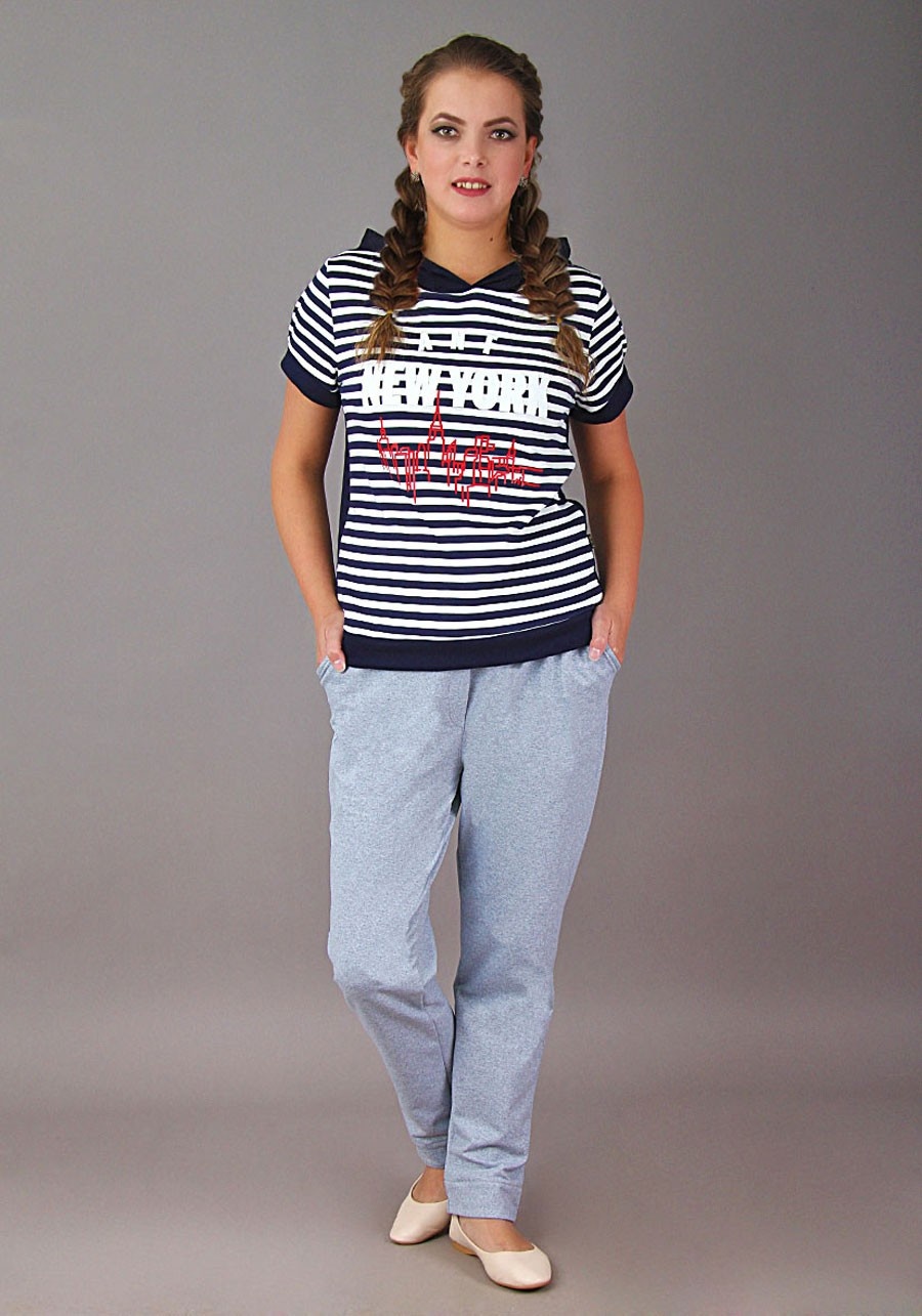 Ткань изделия: кофта - интелок-пенье; брюки - футер петлевой. Состав: кофта - 100% хлопок; брюки тёмно-синие - 95% хлопок, 5% полиэстер; брюки серые - 57% хлопок, 38% полиэстер, 5% лайкра. Уникальный костюм <<Леся>> состоит из кофты с коротким рукавом и капюшоном и брюк модели <<Стронг>>. Пояс и рукава на манжетах позволяют зафиксировать изделие, выпуклый принт живо контрастирует с основной тканью, но удачно сочетается с брюками. Модель <<Стронг>> низа костюма обладает поясом на резинке и шнурке, двумя передними и одним задним карманом, имитацией ширинки и манжетами, которые можно загнуть или оставить как есть. Отличный вариант для стильных особ!